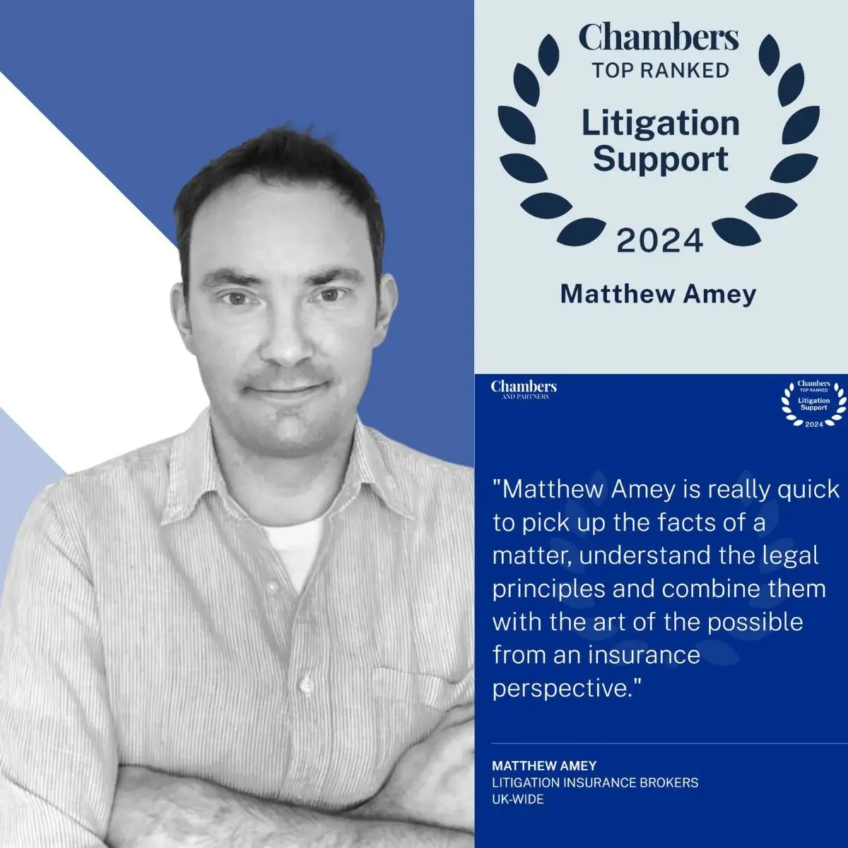 Congratulations to TheJudge’s Matthew Amey for again receiving a top individual rank from Chambers and Partners, acknowledging his expertise. Matthew has been at the heart of the litigation finance market since its infancy, and we are proud to celebrate his achievement as the longest-running ranked individual in the litigation funding and litigation insurance broker categories. His knowledge and creativity in arranging litigation finance continue to set the standard in our industry.